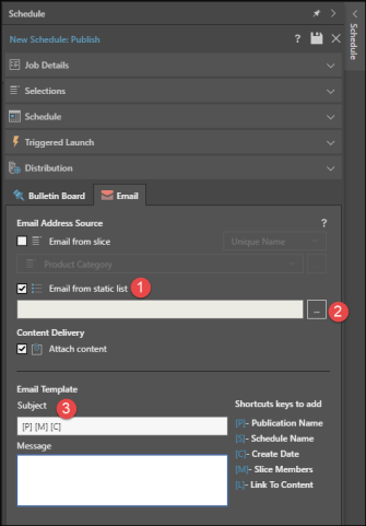 From the Email Distribution window, select 'Email from static list' and then click the button (labeled number 2 in the image) to open the Email Editor. Be sure to select 'Attach Content' if the publication should be attached to the email.