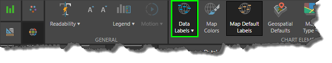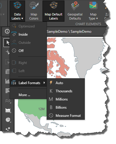 When working with shape maps, the Data Labels feature will be exposed in Component ribbon. By default, it is enabled to show values in the map; you can opt to show percentages and/ or captions, or disable data labels. You can also change the formatting for value labels, and customize label font. These functions help you to customize the look and feel of the map, by controlling what kind of labels appear, and how they look.