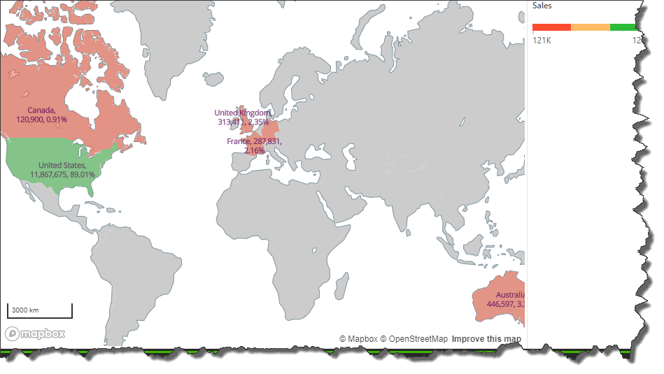 In this example, labels were enabled to show value, percentage, and category. We can see that the United States made over $11, 000,000 in sales, accounting for 89% of total sales.