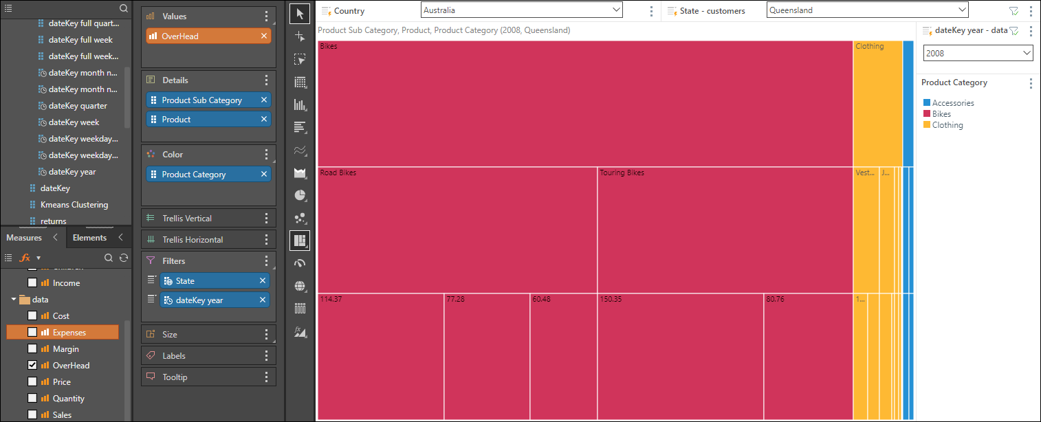 In this example, the Product Category hierarchy was added to the Color drop zone, and the Product Sub Category and Product hierarchies added to Details. The given value is Overhead. The resulting chart displays the overhead for products in a hierarchical fashion, and color-coded by product category.