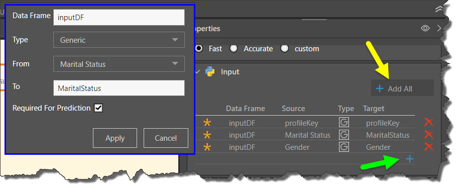 Input: lists the columns that were input into the algorithm in the learn function (blue highlight above). To add the input columns, you can add all columns from the table to which the Python node is selected (yellow arrow below), or configure each column separately using the add icon (green arrow). To edit a column, click on its listing.