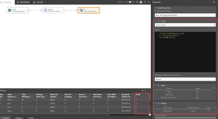 In the screenshot below, the data frame is made up of the Age, Daily Rate, and Distance from Home columns. A DBSCAN clustering algorithm has been applied, and the resulting column (clustering number in this example) can later be analyzed in Discover.