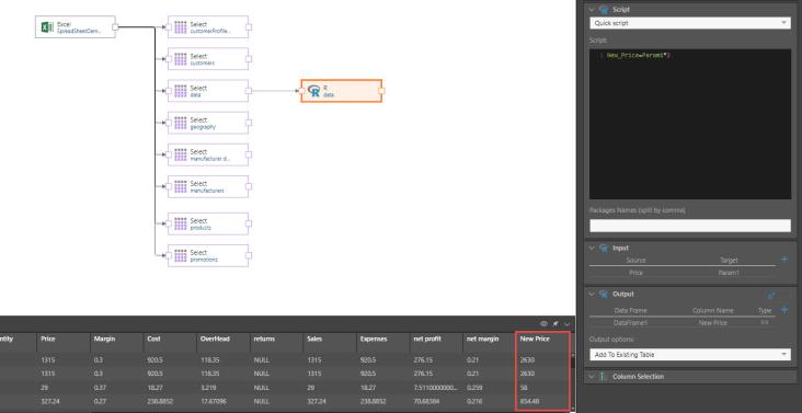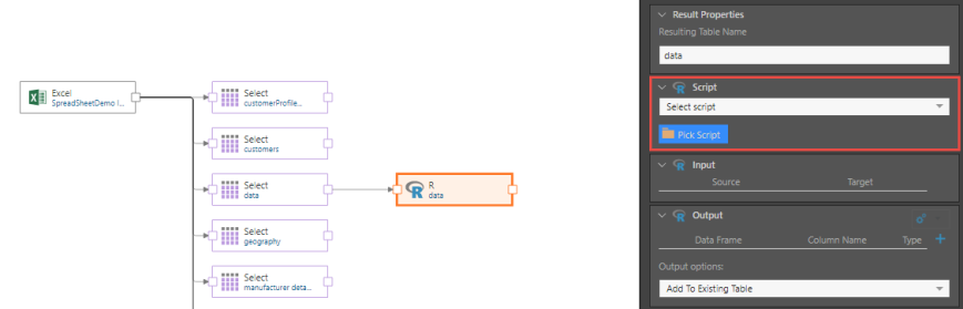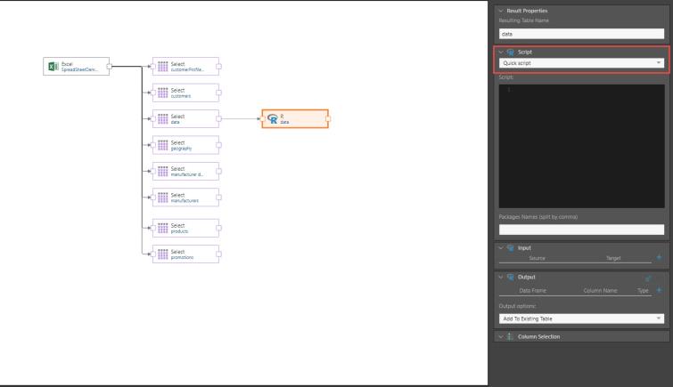 The Regular Script function allows you to inject scripts into a table, during the ETL. The results will then be added to the selected table as an additional column, or you can use your script to create a new table.