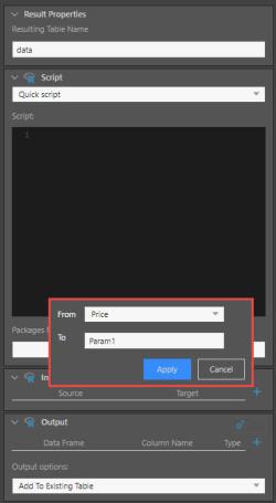 Click the plus sign under input. In From, select the column you want to apply the script to. From To, enter the name that will be used in the script, and click Apply.