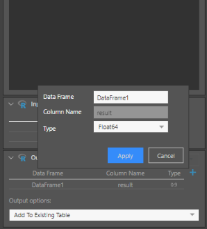 To manually configure the output columns, click the plus sign under Output. Name the new column as written in the script, and enter the output type (float, string, or integer).