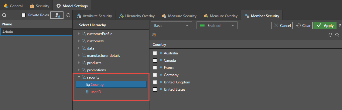 Note: while basic member security is available for all supported data models, dynamic member security is not supported for MS OLAP, Tabular, SAP BW and SAP Hana models and cubes.