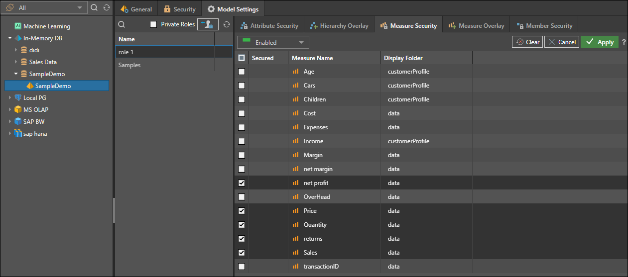 In the image below, the Cost and Expenses measures are disabled for the Samples role; the rest of the measures will remain enabled for the given role.