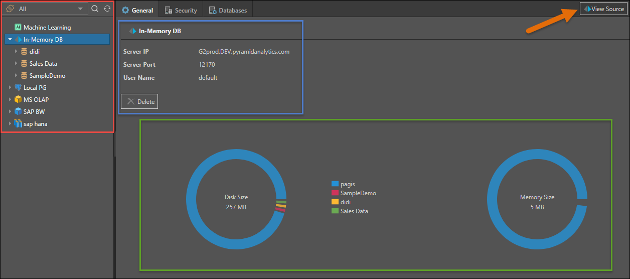 Note: For Pyramid In-memory data source servers, two extra charts are displayed showing disk size and memory size (green highlight).