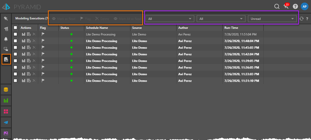 The board shows the progress and status of current or previously executed model jobs. By default, the board displays ALL unread notifications around submitted jobs. Use the filter drop downs (purple box) to change the filters driving the listing of items.