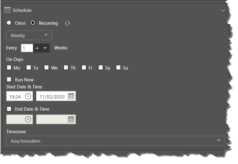 For each recurring schedule option, you must select a start date and time - this is when the schedule job will start running.