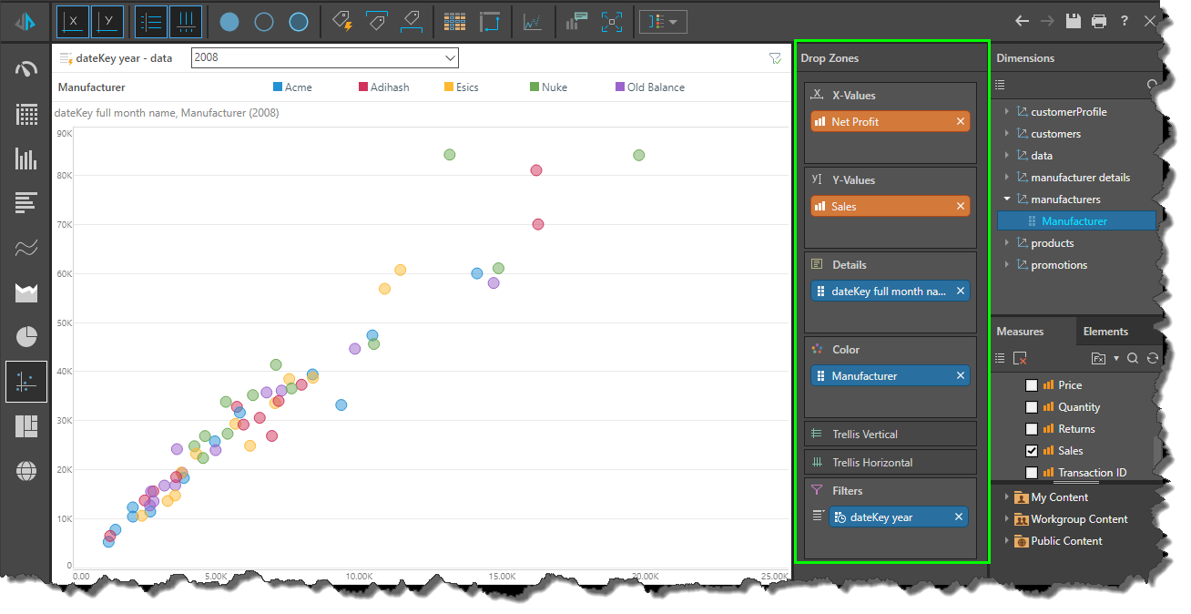 The Drop Zones panel features several different types of drop zones, with each zone driving a corresponding component in the visualization. The chose visual also determines which drop zones will be exposed; for instance, when a grid visual is chosen, the Columns and Rows zones appear in the drop zones. But if the visual is changed to a gauge, Columns and Rows will no longer appear; instead, you will see Target and Status. Click here, for more information about how the metadata trees, drop zones, and visualizations drive each other.