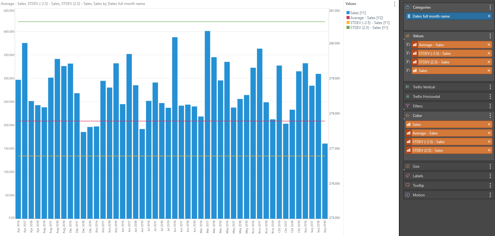 In the chart below, we have chosen to show average sales and standard deviation of sales on a bar chart using primary and secondary axes.