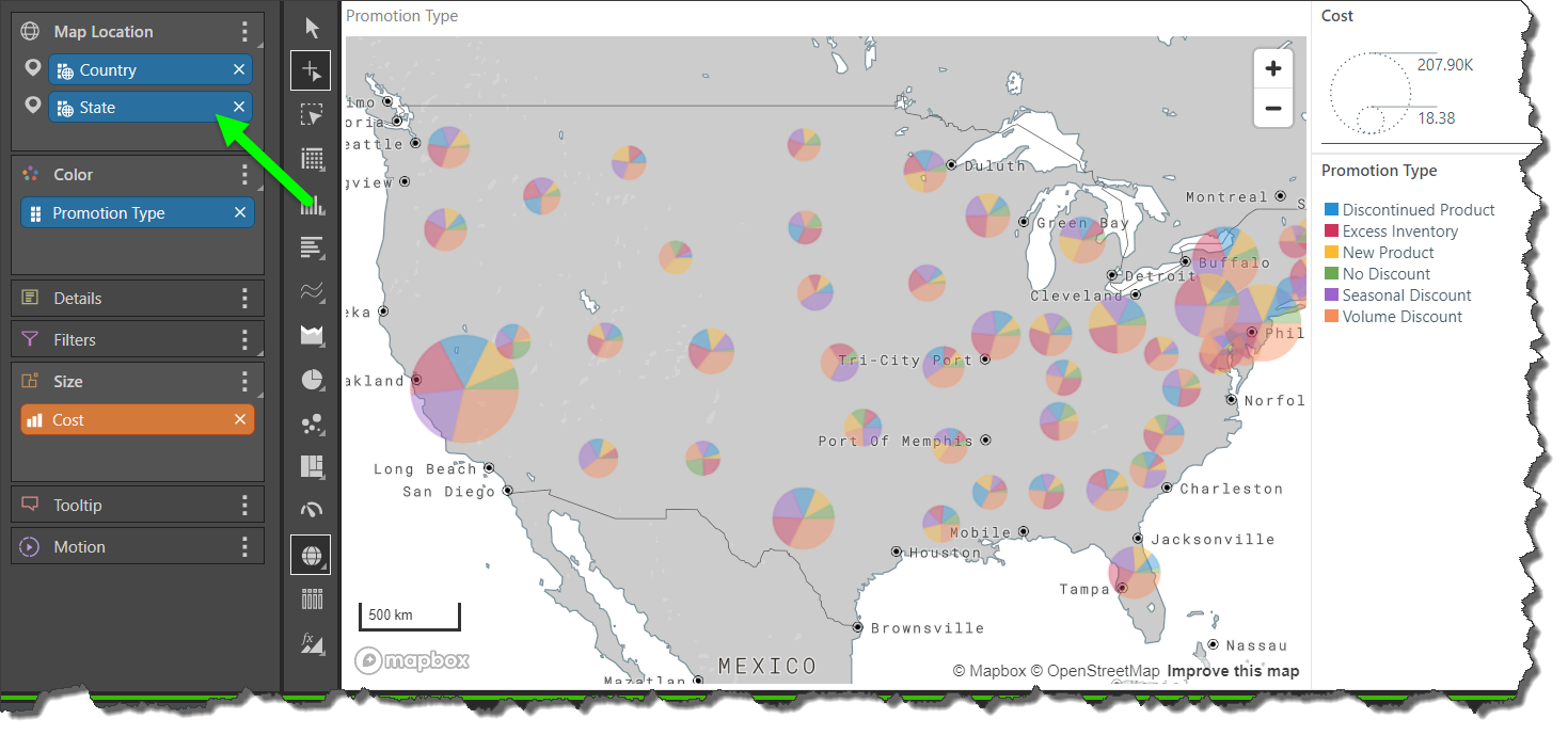 In the example below, the County hierarchy was added to Map Location; each country is represented with a bubble. The Cost measure was added to Size, so that cost is driving the size of each bubble. The Promotion Type hierarchy was then added to Color, splitting each bubble into a pie with each segment representing a promotion category.