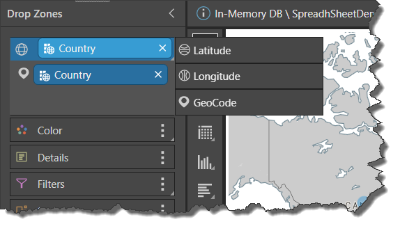 Open the Map Location sub menu to expose the sub-drop zones: latitude, longitude, and geocode. Pyramid automatically detects if a chip is latitude, longitude, or geocode, but you can switch them around from this sub menu if required.