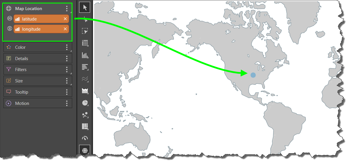 In this example, the latitude and longitude measures were added to Map Location; because these are aggregate measures, only a single aggregate coordinate is mapped: