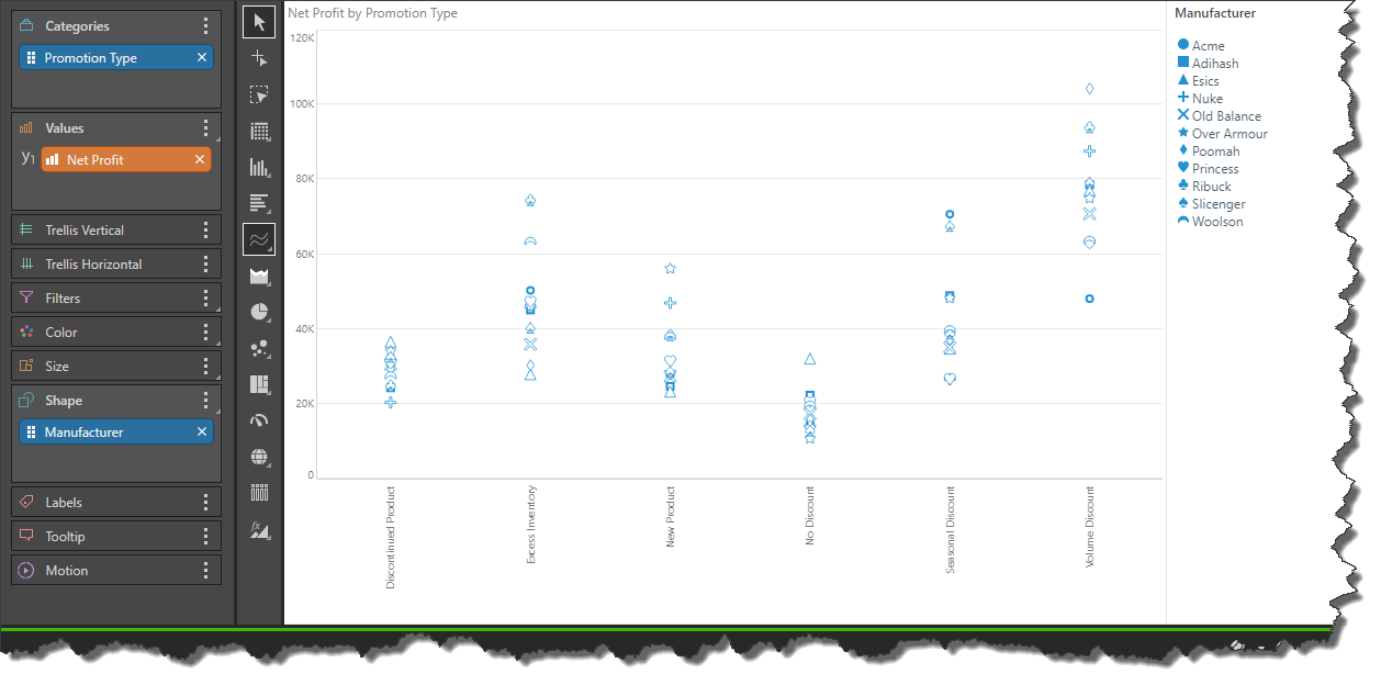 From the shape legend, you can perform series editing to specify which shape should be displayed for a given element. You can also combine the color and shape legends when both display the same measures.