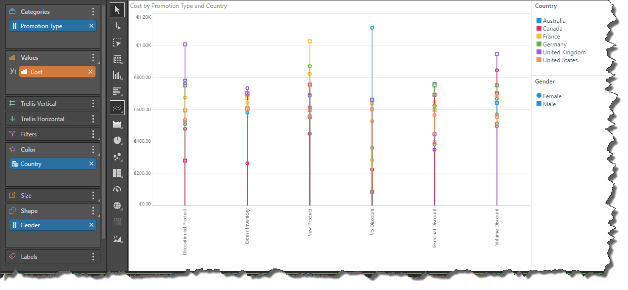 Add hierarchies to the Shape drop zone to drive the shape of the corresponding data points. Each element in the hierarchy will be represented as a different shape in the visual. This is particularly useful if want to add several hierarchies to the query, and display them in ways that are easy to interpret. For instance, when creating a scatter chart, you may want to add an additional hierarchy aside from those driving the color and details. In this case, you can add a hierarchy to the shape zone.