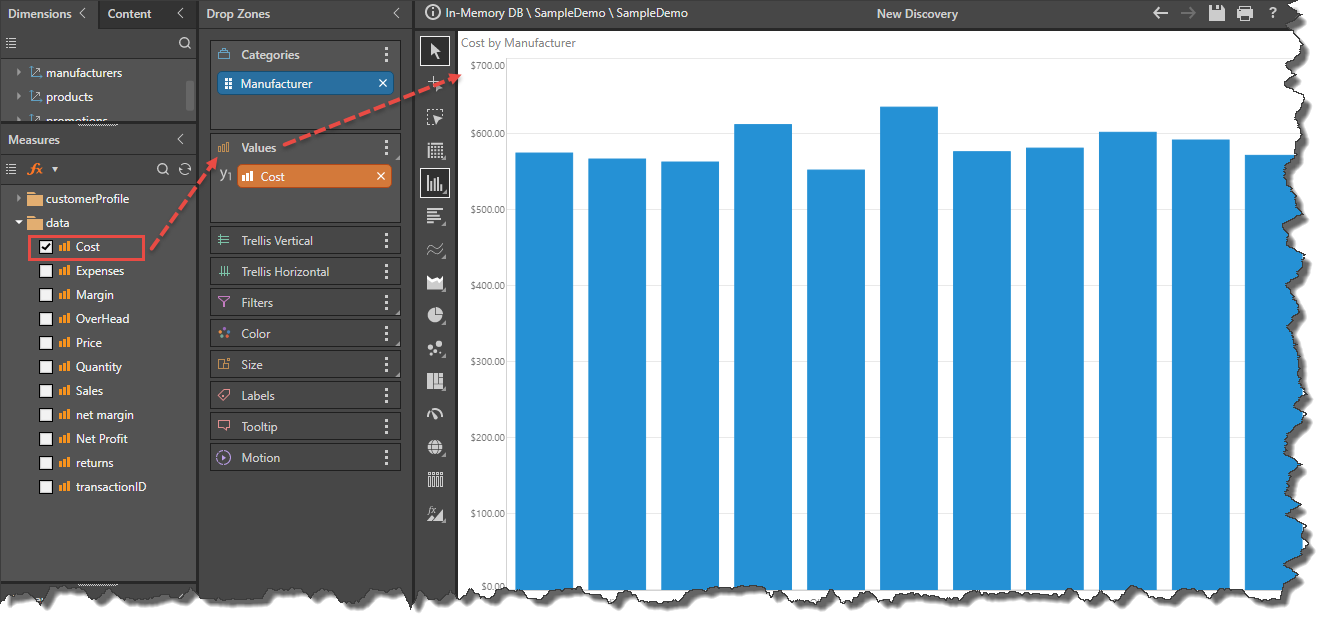 When working with charts (excluding scatter and map charts), at least 1 measure must be added to the Values drop zone; this measure will be used for the chart's y-axis, and (depending on the chart type) will drive the size, height, or length of the chart's segments.