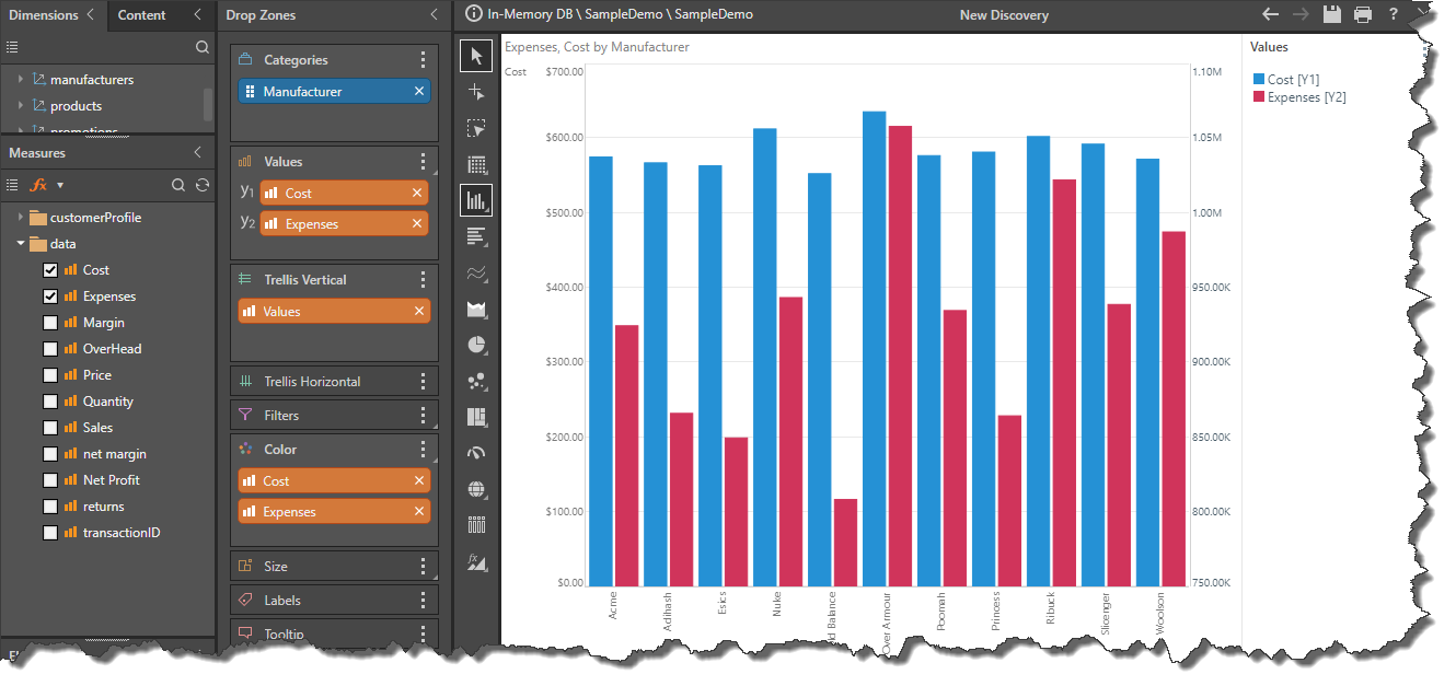 If more than one measure is added to Values, and Values chip will be generated and added to Trellis Vertical, resulting in multiple charts. The Values chip may be moved to Trellis Horizontal or Filters.
