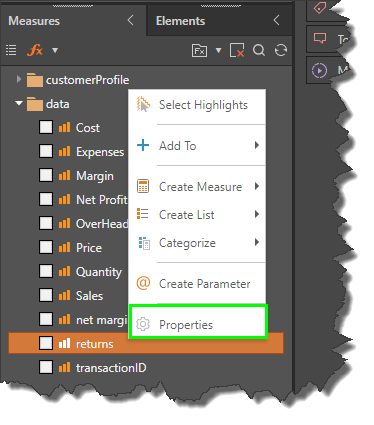 In this example, the caption for the measure 'returns' is changed to 'Returns'. Start right clicking on the measure for which you want to create an overlay; select Properties.