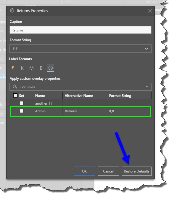 To remove the overlay properties and revert back to the default measure properties that were set in the model, click 'Restore Defaults'.