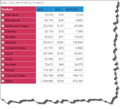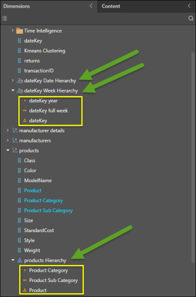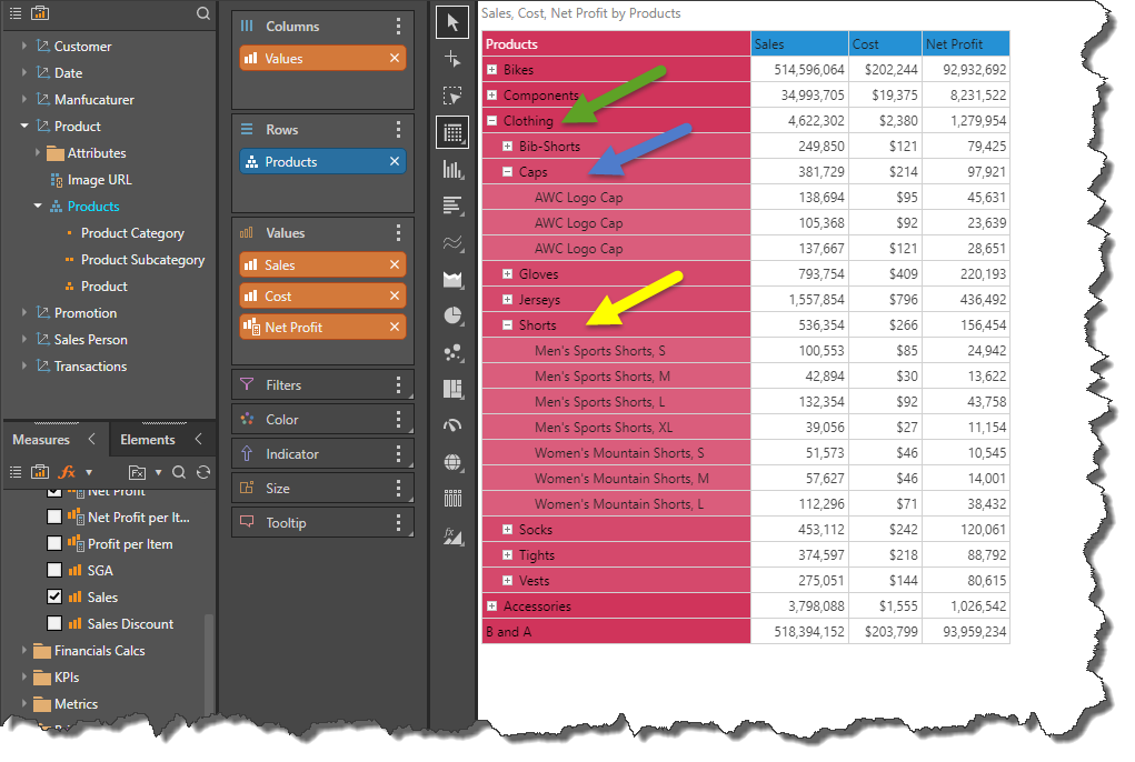 When a regular hierarchy is added to a grid, it exposes expand and collapse icons in the visual. In the example below, the first level of the Products hierarchy was added to the query. The Clothing element was expanded (green arrow) exposing its children elements. The Caps (blue arrow) and Shorts (yellow arrow) elements were then also expanded, exposing their child elements.