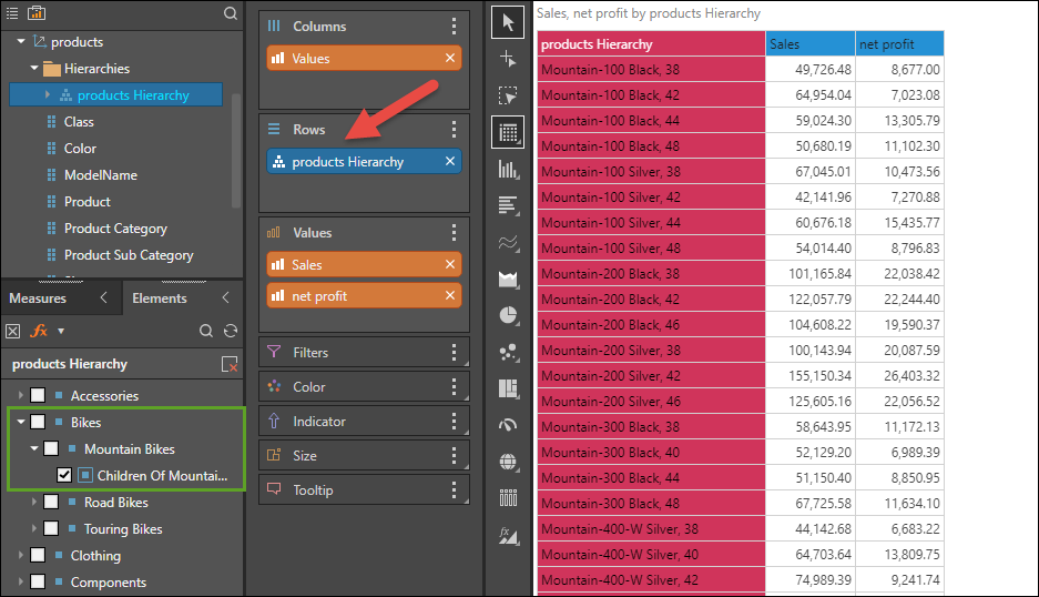 In the example below, the Products hierarchy was added to the query; its chip is labeled according to the hierarchy name, rather than the current level of the hierarchy (red arrow). From the hierarchy's Elements tree (green highlight), we can see that the drill path is Bikes > Mountain Bikes > Children of Mountain Bikes.