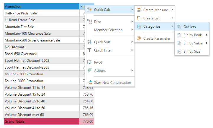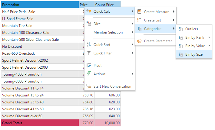 Notice that the bin names are auto generated from the highest and lowest values in each bin. Also, each band has the same number of promotional items (4 items each).