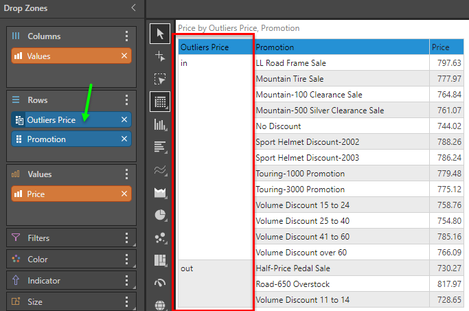 The outlier logic is only available on values or measures. It cannot be applied to hierarchies. As described, the calculation is based on the existing data points in the current query. Once determined, the outlier flags remain static regardless of any subsequent changes to the query.