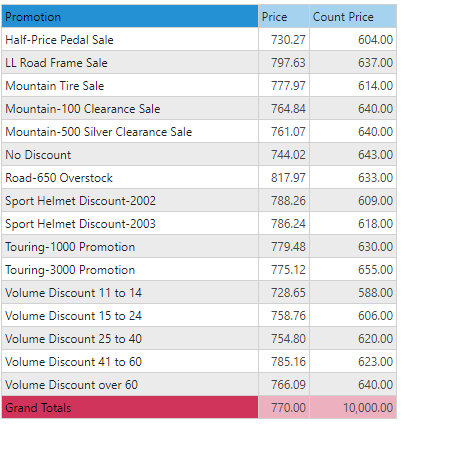 To see the effect of this Size bins, consider the following simple query - showing average price per promotion and the number of rows per promotion category.