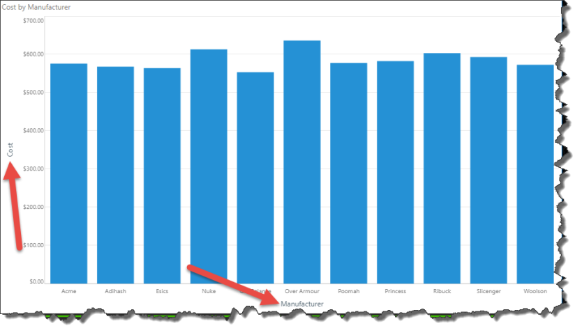 When working with charts, enable Axis Titles to show the title of each axis; the axis title is named according to the given measure and hierarchy. This feature is exposed when working with Cartesian, segment, and plotted charts.