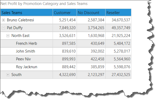 If the grid contains a regular hierarchy on rows, the member captions for the expanded levels of the hierarchy are indented:
