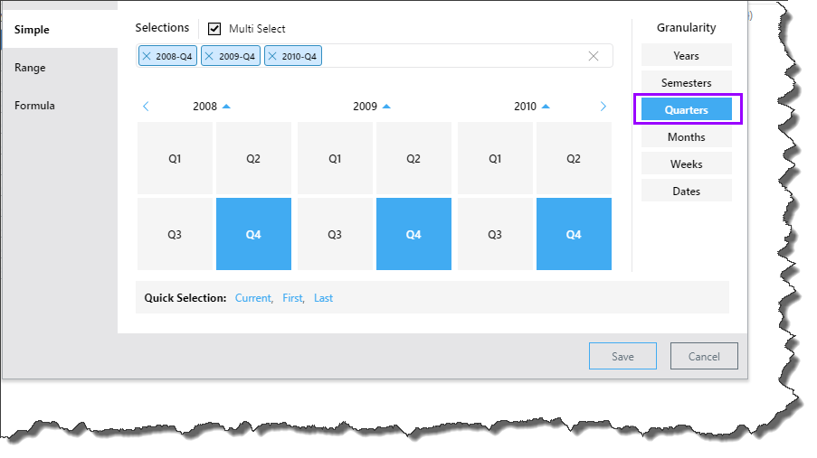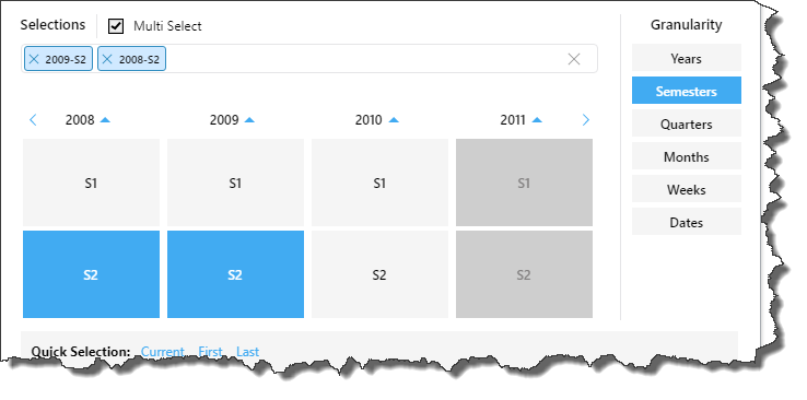 Current: depending on the given level of granularity, selects today's date (if it exists in the system) or the current year, semester, quarter, month, or week. If the current date/ time period doesn't exist in the system, the last date/ time period will be selected instead.