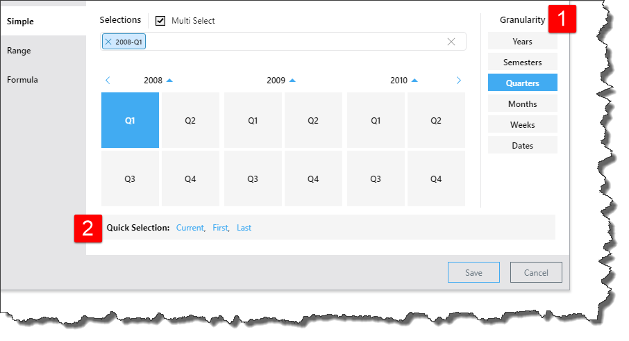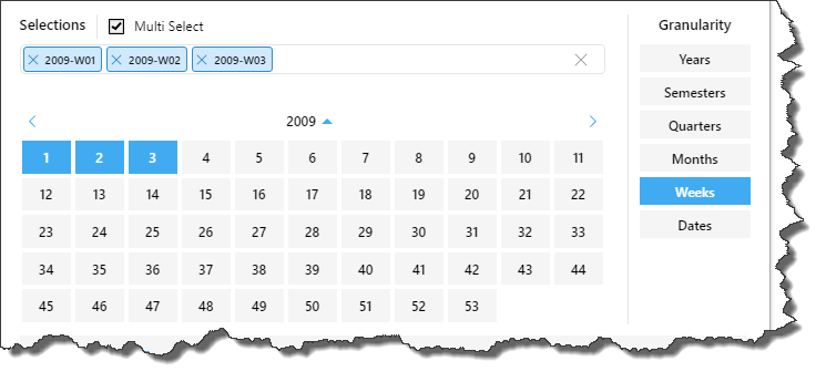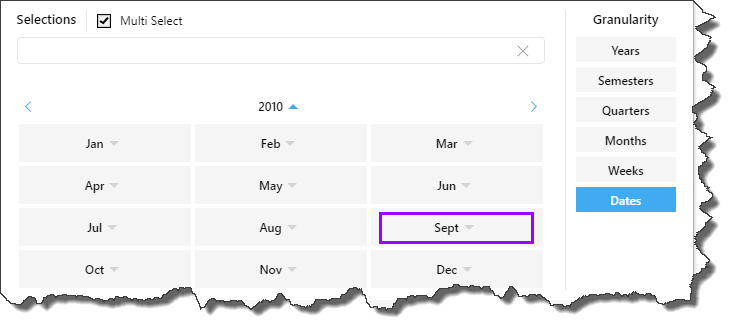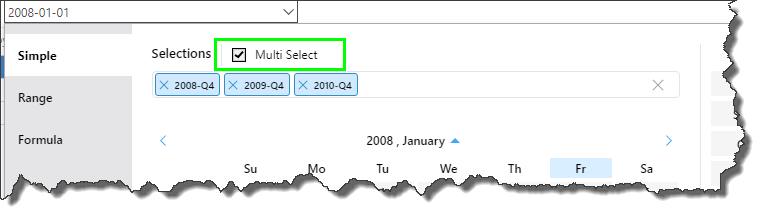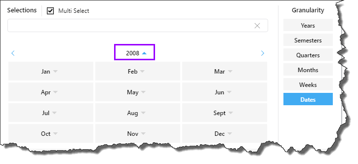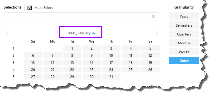 The Simple calendar picker enables the selection of one or more elements. To select more than 1 element, ensure that Multi Select is enabled; you can then select multiple elements from any level of granularity. The query will be filtered by the element(s) that you've selected.
