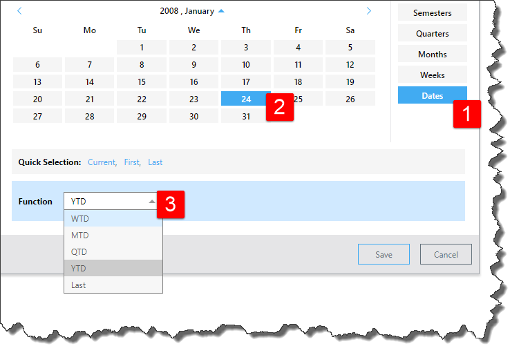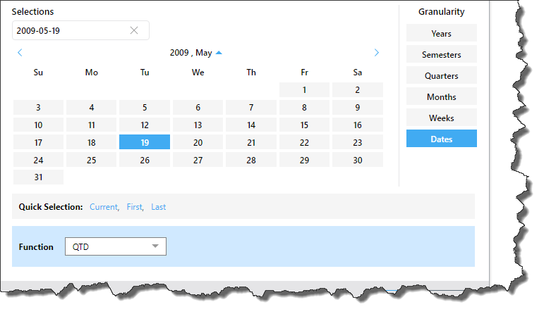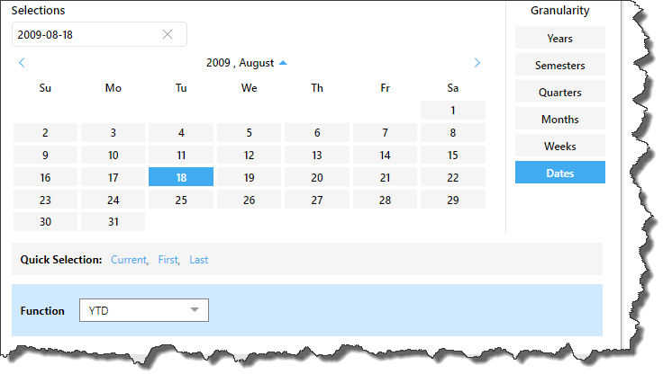 The Year to Date function is available for all granularity levels. It filters the query by all dates or time periods from the beginning of the selected year, up to and including the selected element.