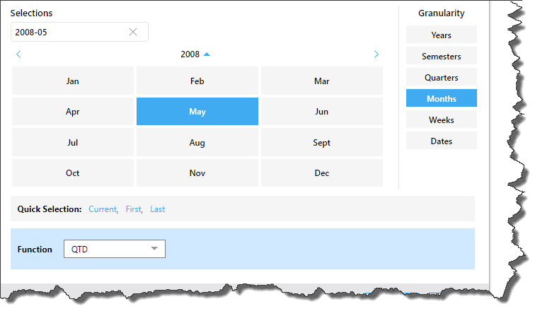 Now the granularity is changed to months; the selection will filter by all months in Q2 2008, up to and including May: