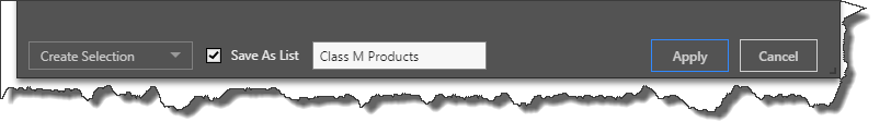From the selection type drop-down, choose Create Selection. Then, select the Save As List checkbox and name the list "Class M Products". Not only will the selection be used in the query, but it will also be used to produce a list.