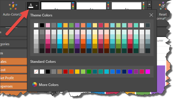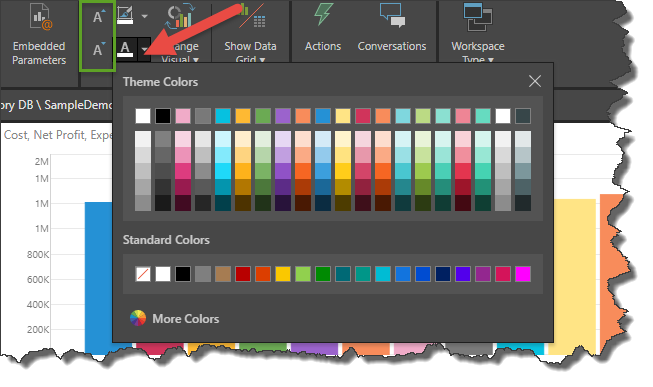 The report title size (green highlight) and color (red arrow) can also be changed from the Report ribbon: