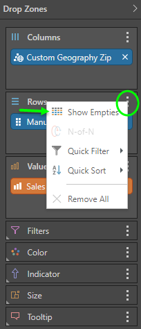 Empties can also be shown by right clicking on an OLAP hierarchy chip in the drop zone to show / hide its empties.