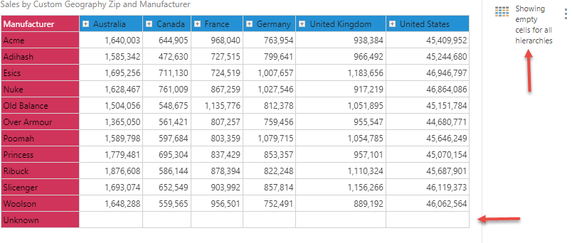 - In SQL data sources, show empties will only show 'null value' combinations across different hierarchies that have common transactional data points. It does NOT manufacture blank values for items that have no existing relationship.