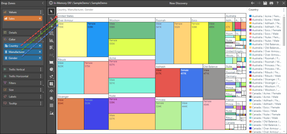 Grouping by color organizes the data by the chips in the Color zone (green arrows below), rather than those in the Details zone, thereby grouping common colors together in the chart. In this case, the member elements in the hierarchy in the in the Details zone will be displayed as labels (red arrows).
