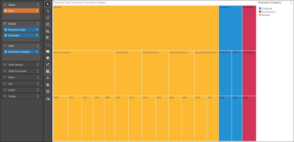 In this example, the Product Category hierarchy was moved to the top of the Details drop zone, while a second measure - Sales - was added to the Color zone. The Product level of the chart is color-coded according to the Sales measure's continuous legend. In this way, the first measure (in the Values zone) drives the size of the chart segments, while the second measure drives the color.