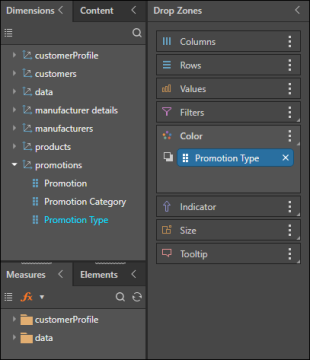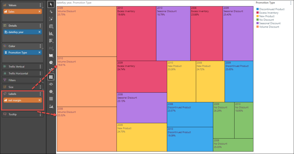 Using the Sample Demo model, add the Promotion Type hierarchy to the Color drop zone;