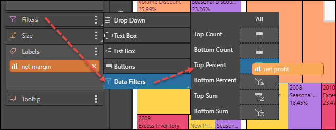 Using the Net Profit measure, create a top percent numeric filter. To do this, drag the Net Margin measure over the Filters zone; from the submenu go to Data Filters, then drop the measure chip onto Top Percent from the next submenu.