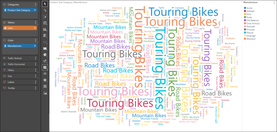 In the image below, the chart shows Sales of Product Subcategory by Manufacturer: the text represents the product subcategories, the color represents the manufacturer, and the text size represents the sales.