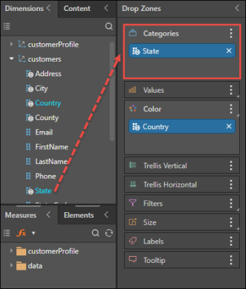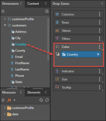 From the Customers dimension, add the Country hierarchy to the Color zone.