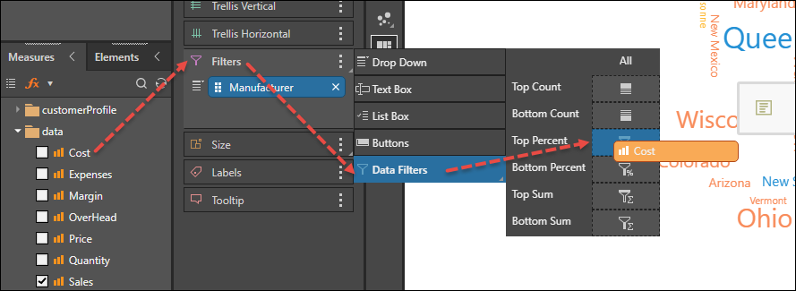 Add the Cost measure to the Filters zone to create a data filter; dragging the Cost measure over the Filters zone, drag it to Data Filters in the submenu, then drop it in Top Percent from the next submenu.