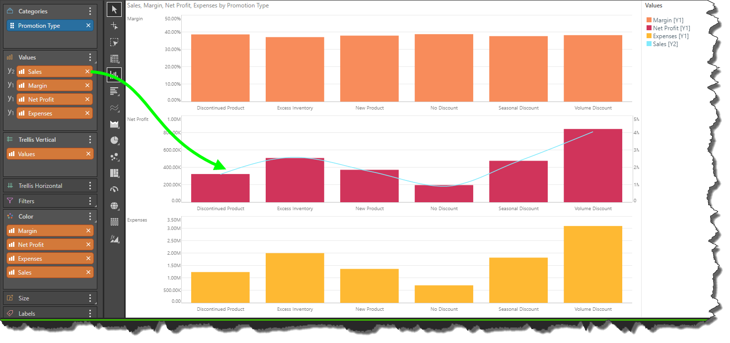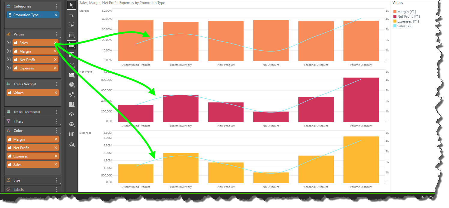 In the example below, the chart is trellised by 3 measures: Margin, Net Profit, and Expenses. A fourth measure, Sales, as added to the Secondary Axis. It is added to the Spline Chart visual for the Net Profit column (red highlight):