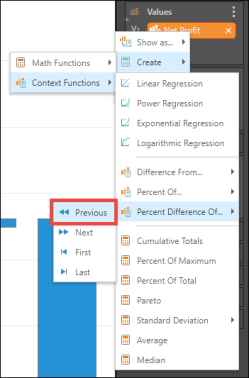 At this point, we can add color logic to the given measure, to make the chart more meaningful. To do this, add a second orange chip representing the given member to, and right click on it. Select the calculation that fits the way you want to visualize the difference between values in the chart. In this example, Percent Difference of Previous is selected.