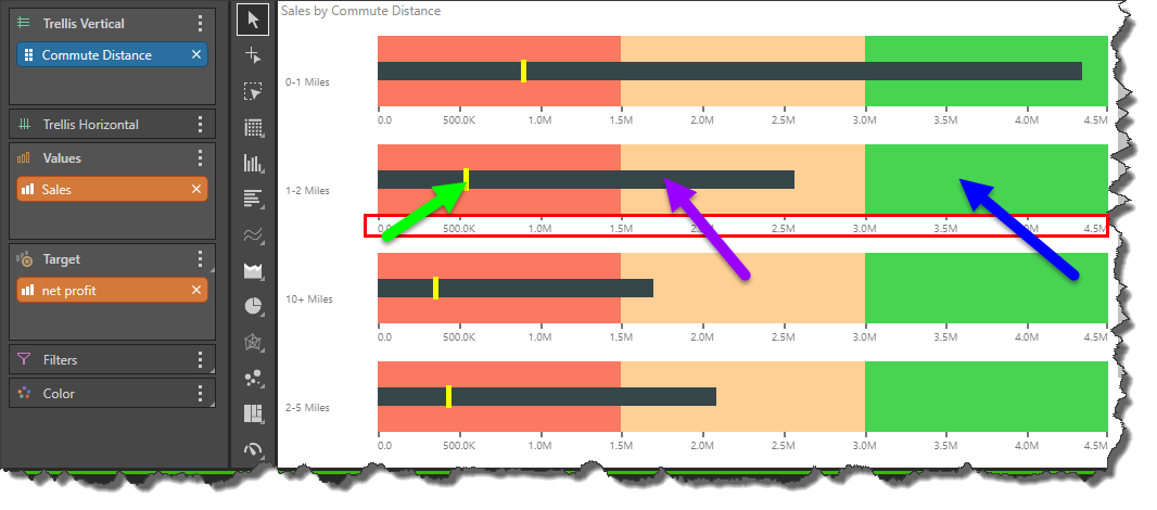 The Sales measure was added to Values; this is represented by the bar in each bullet chart (green arrow). It also drives the scale of each chart (green highlight).